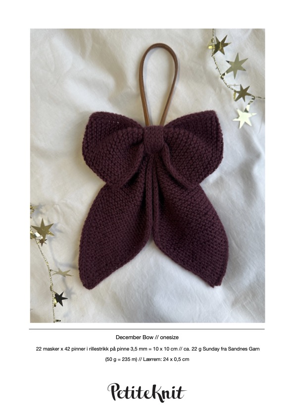 ecember Bow strikkes frem og tilbake i ett stykke i rillestrikk med i-cordkanter fra spiss til spiss. Til slutt foldes arbeidet til en sløyfe og sys sammen. Det monteres en lærrem bakpå sløyfen, slik at den kan henge.